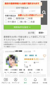 時間帯や資格を持ったタスカジさん、タスカジさんの性別などでもっと細かく絞り込むことも可能です。